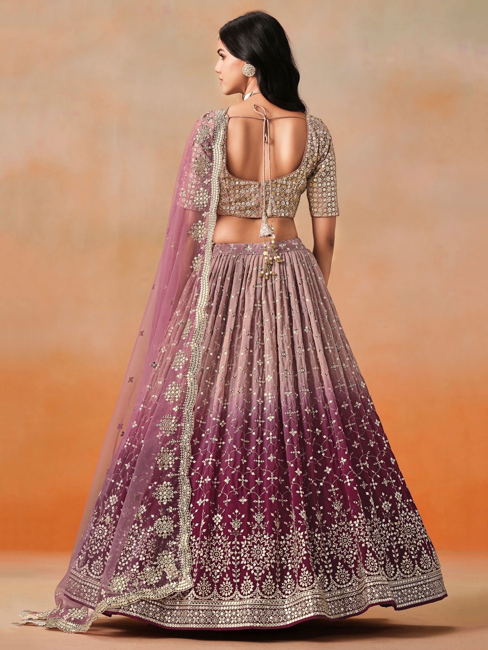 Lehenga: Georgette fabric with zari and sequins work, 3.5 meters flair. Fits waist up to 43", length 43"